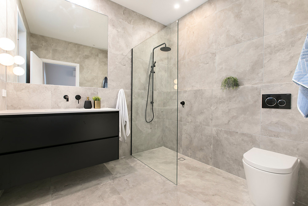 The home's interior features include ultra-modern design elements, such as the walk in shower, European stone, timber staircase, and beautiful galley style kitchen.